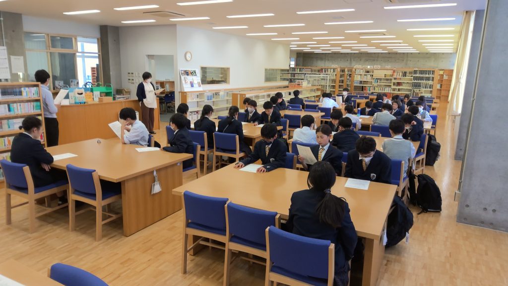 木曜日の業後には図書館オリエンテーションが行われました。本校の図書館は中高で共用します。高校の図書主任の先生から図書館の開館時間や使い方を教えていただきました。さっそく本を借りている生徒もいました。